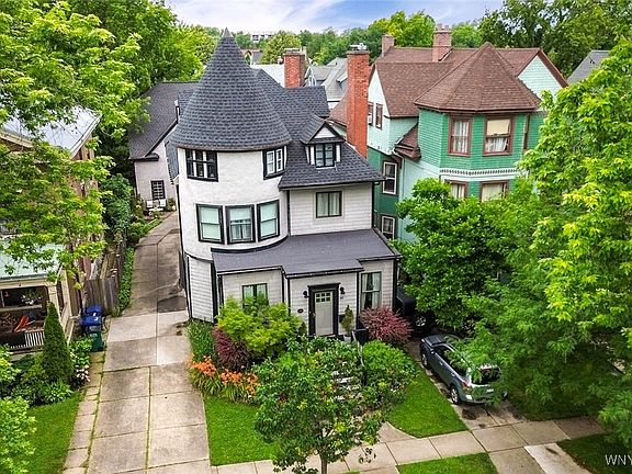 This exceptional Elmwood Village Victorian is an unmatched combination of classic, traditional curb appeal and thoughtful, artistic modern interior design. Stucco and shingle exterior with distinctive turret and welcoming front porch opens to large entryway room with built in bookshelves and extensive closet space. Fantastic open floor plan layout offers spacious living room featuring brick woodburning fireplace (NRTC), floor to ceiling all-new windows for incredible natural light, gleaming maple hardwood floors, curved wall detailing perfect for art display, and more. Modern fully applianced kitchen with designated dining area boasts modern fixtures, expansive cabinetry, oversized sink, and brick detail. Glass doors lead to a gorgeous raised deck, the perfect transition for indoor/outdoor entertaining! Primary suite stuns with fireplace (NRTC) in sitting area, curved wall to mirror exterior turret, and ample walk in closet and modern en-suite bath with double sink and oversized glass stall shower. Enjoy both full hallway bath and convenient laundry space! Two additional bedrooms, one with en-suite bath. Fully finished third floor, with brand new full bath and four bonus rooms, is a truly versatile space! Updates abound with all new Pella windows, new roof (2020), new electric, and fully reinforced basement. Full Renovation completed by Hayes Construction Services. Outside, 5+ car barn/garage (2400sqft) is second-to-none, with all new floors, walls & ceilings, school house lights, full stairs to upper level with tall rafters and beautiful view through large hayloft door. Would make the perfect studio, party venue, or home office! Private fully fenced yard with beautiful plantings and courtyard space feels like an absolute secret garden. Nothing to do but move in and enjoy gorgeous spaces and a perfect city location; great proximity to Elmwood Village attractions, parks, theatre district and medical campus. Showings begin Tuesday 9/23 @ 5:00pm.