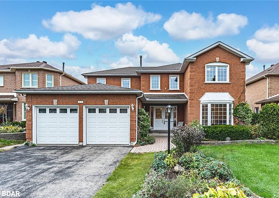 WELL-MAINTAINED ALL-BRICK TWO-STOREY WITH OVER 2,800 FINISHED SQ FT IN AN ESTABLISHED NORTH-END NEIGHBOURHOOD! Tucked within one of Barrie’s established north-end neighbourhoods, this beautiful all-brick two-storey home makes a lasting impression with its grandeur exterior, double front doors, manicured gardens and a double garage that adds to its curb appeal. Offering over 2,800 square feet of finished space, the interior is warm and inviting, with thoughtful details throughout. The bright kitchen features timeless white cabinetry, generous counter space and a breakfast area with a walkout to the patio, creating an easy connection to outdoor living. The combined living and dining room showcases a large bay window that fills the space with natural light, while the family room’s gas fireplace offers a cozy spot to gather. Hardwood flooring adds warmth and character to both spaces, and the main floor laundry with garage access adds everyday functionality. Upstairs, four spacious bedrooms include a primary suite with double doors, a walk-in closet and a 4-piece ensuite, while the three additional bedrooms share a main 4-piece bath. The basement extends the living area with a generous rec room and an additional gas fireplace, perfect for family movie nights or entertaining guests. Step outside to enjoy a private backyard with a patio, mature trees, hedging, a shed and a privacy fence that together create a quiet outdoor escape. Big-ticket updates have already been completed, allowing you to move in and enjoy this beautiful home with confidence!
