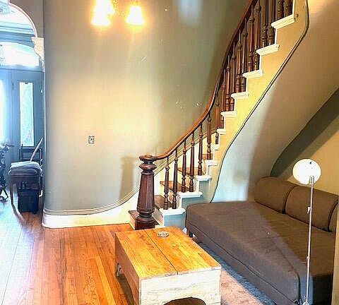 Fantastic investment or owner occupied brownstone with wonderful view of the city skyline! Located right off the highway, on busline or walk to work, restaurants, worship or entertainment! Live on the top 3 floors with 3 bedrooms, 2 full baths, office and eat-in kitchen. Enjoy floor to ceiling windows, hardwood floors, updated baths, laundry closet upstairs and beautiful original details, while renting out the garden apartment with its own entrance and separate utilities.