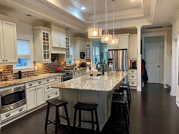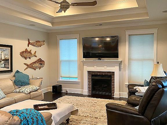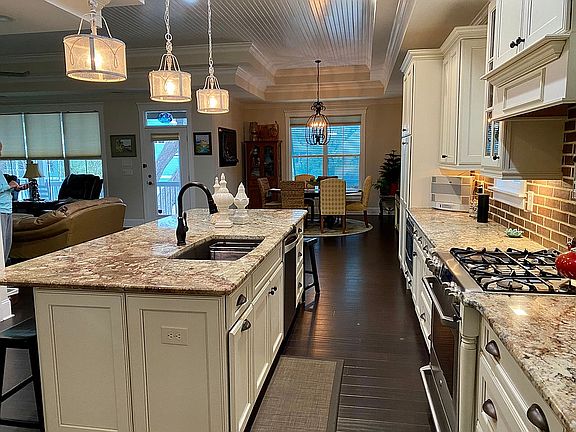 Custom built, Raised beach house. Open floor plan. Large kitchen. 11 ft double tray ceilings with tongue and groove ceiling. Extra trim package. Upgraded cabinets. 11x4 ft island in kitchen. Gas fireplace. Sound system with speakers on front and rear porches included. Rinnai water heater. Chair lift. 200 + year old southern live oak tree. Hot tub on back porch.