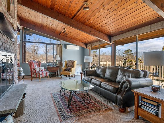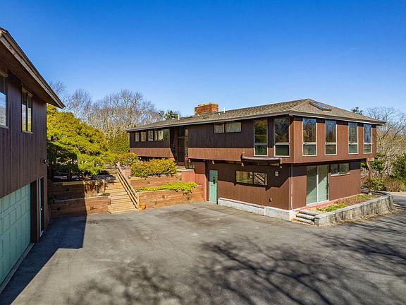 Looking for that elusive in-law apartment or dedicated home office space, then look no further. Welcome to 44 Crestview Drive, a stunning deck house that exudes mid-century modern charm. This 4br/2ba home sits prominently on a hill, and is flanked by a detached 2 car garage with a charming 1br/1ba licensed in-law apartment above. With a combined 3224 square feet of living space, this property provides ample room to live and entertain.Upon entry, you'll be greeted by the richly hued beams and interior mahogany trim that accentuate this home's unique architecture. The floor-to-ceiling windows and doors provide expanses of glass that help flood the house with natural light, creating a warm and inviting atmosphere. The teak kitchen cabinets add to the home's ambiance, while the formal dining room provides a perfect setting for hosting memorable gatherings. From the parquet floors to the gorgeous tongue and groove wood ceilings displayed throughout the main house, everything speaks to its mid-century modern appeal.This home boasts two wood burning brick fireplaces, perfect for cozy evenings--one of them adorned with floor-to-ceiling rustic brick that definitely adds to the home's character. Outside, the deck offers a private outdoor space for seasonal alfresco dining. Or, seek out the private brick patio to relax around a firepit.