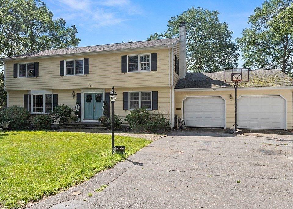 This colonial home has beach rights to Wyman Cove and features five bedrooms and two and a half baths. This property offers a living room with a bay window and formal dining room with crown molding, an eat-in kitchen and a family room with a fire place and built-ins all on the main level. The slider of the kitchen leads to a deck overlooking the back yard. The second floor features a primary suite with hardwood floors, two oversized closets, a dressing room and updated primary bathroom with marble tile, countertops, a walk-in shower and vanity. Each of the other spacious bedrooms offer hardwood floors and double closets. The additional full bath on the second level has a double vanity and a tub with a tiled shower. The lower level has additional storage, a large finished bonus room with sliders leading directly to the backyard. Other features include hardwood floors throughout, newer windows, two sitting areas in the yard, shed, two car garage and so much more.