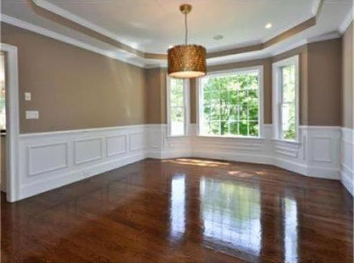 New Construction with fantastic finish work from local well known builder. 4100 SqFt on 3 finished levels. First floor w/ coffered ceiling in living room, tray ceiling in dining room, and large chef's kitchen with breafast area leading to large deck in back yard. Big open family room with gas fireplace. 2nd floor with 4 bedrooms, 3 full baths including elegant master suite with double 10' ceiling and double walk in closets. 3rd floor with additional 5th bedroom, office, and play room. Great opportunity to customize. Quiet street walk to to town center and train.