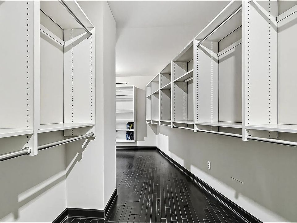 The primary bedroom is generously proportioned, large enough to accommodate a separate seating area or home office. Adjacent to the bedroom is a vast dressing room, ideal for storage and organization. With northeast exposures, the space is flooded with natural light. The spa-like en-suite bathroom showcases marble tiling, a glass-enclosed rainfall shower, and a wide vanity with ample storage. An additional powder room with in-unit washer/dryer adds convenience.