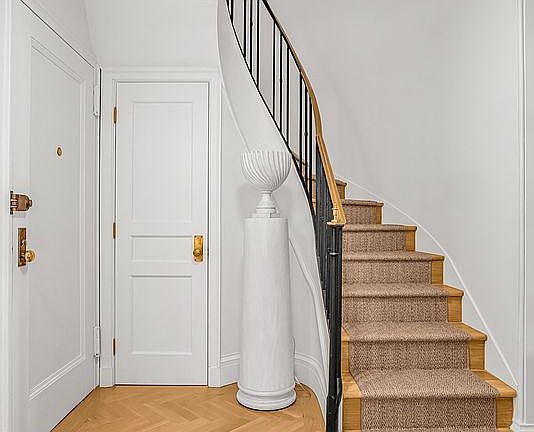 A graceful curved staircase leads to the upper level, where two bedrooms with ensuite baths are thoughtfully separated from the entertaining space. Each bedroom has abundant direct sunlight and ample closet space. The Primary Bedroom enjoys a corner exposure with Park views. The immaculate windowed bathrooms are classic, timeless and elegant. Vented washer dryer is conveniently located off the hallway. This floor is accessible via 12th floor elevator landing.