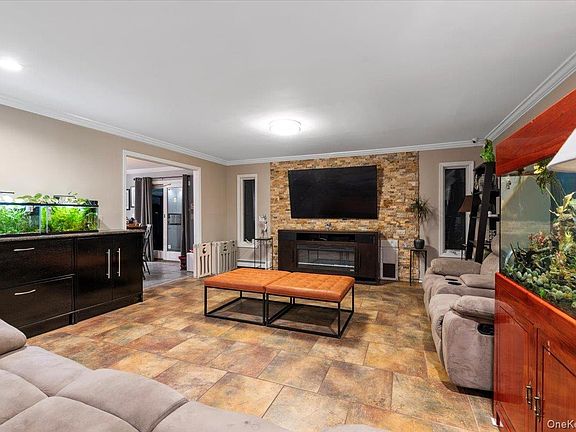 Discover the charm and versatility of this 4- bedroom, 4- bathroom colonial home in Hicksville. The main level features all tile ceramic tile floor, a spacious living room and a large eat-in kitchen, equipped with granite countertops, an abundance of cabinets, a gas cooktop on an oversized island, double ovens, and stainless steel appliances. Sliding doors lead to a serene backyard. A flex room on this level can serve as a dining room, office, or additional bedroom, complemented by a half bathroom. Upstairs, you'll find a generously sized primary ensuite with vaulted ceilings, alongside 2-3 additional bedrooms and a full bathroom. One bedroom currently opens into a larger space but can easily be converted back to create a fourth bedroom. The basement, with with its own separate entrance, includes a large finished area with a full bathroom, a walk-in closet, plenty of storage space in utility area, and a laundry room with a new gas heating system.