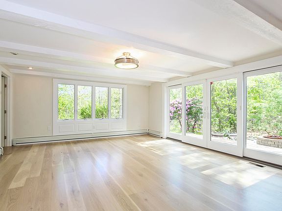 Stylishly renovated by the Goff Brothers for a light and bright beach feeling to a unique home. New bright kitchen with large Ceasarstone breakfast island, radiant heat floors and access to deck and garage. New hardwood floors throughout. Walk to the living room and you will immediately admire the stunning floor to ceiling stone fireplace. Walls, sky-walk, railings, stairs have been freshly painted. New windows to welcome the sunshine in and gaze out to wonderful view of large deck and side yard big enough for a pool. Natural gas (SEVEN ZONES), AC, Solar, 2 fireplaces and a separate in-law apt completely independent utilities. Heated one car garage. Lower level has big bonus room complete with bar, sink and wood-burning fireplace, workshop, half-bath and cedar closet.