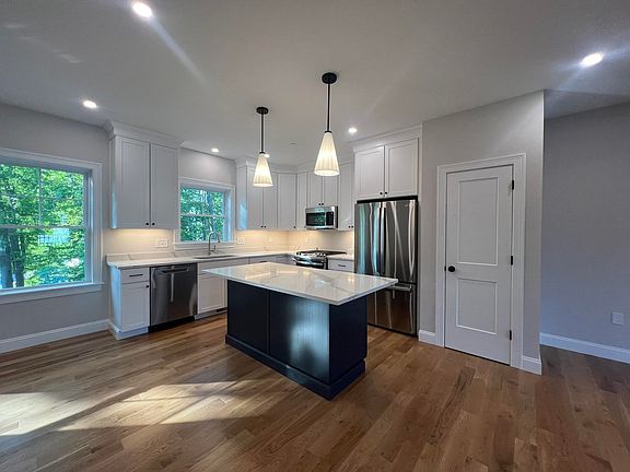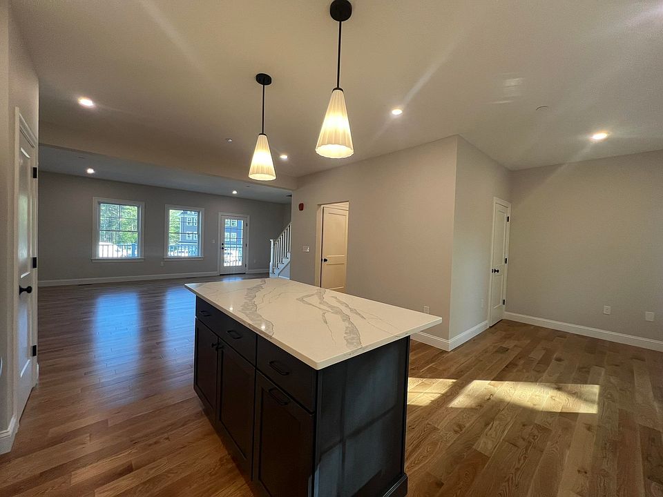 NEW CONSTRUCTION! Welcome to Juniper Commons, a new 50-unit townhome pocket community in a great Portsmouth location. Abutting vast wooded conservation land, this beautifully landscaped community will feature three bedroom, three bath townhomes. This large unit has a two-car garage entry that leads into a finished first floor space ideal for an office, or mud/storage area. Up the hardwood stairs the living level is an inviting open layout with high ceilings, hardwood flooring, and great natural lighting. The spacious living and dining area opens to beautifully finished kitchens including cabinetry to the ceiling, pantry storage, oversized island, stainless appliances, and high end stone countertops. Sliding glass doors off the kitchen leads to a private deck space. The third floor has three bedrooms and two baths, including a primary suite with walk-in closet, and bath with tile shower and glass enclosure. Hardwood flooring throughout all bedrooms and living areas. Central air. Professionally landscaped community with community park, sidewalks, and trail leading to the lush wooded open space behind the homes for all to enjoy! Pictures of a similar unit.