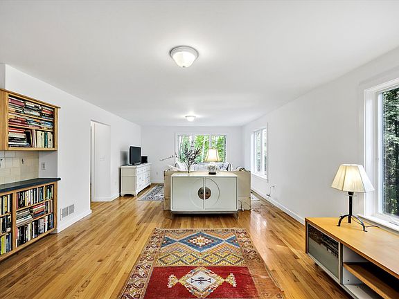 There are three bedrooms on the main floor, along with a spacious living room and a bright sunroom. Upstairs, two additional bedrooms serve as primary suites, each with cathedral ceilings and walk-in closets.