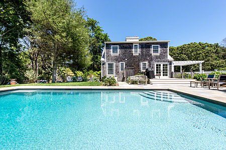 This stylishly appointed Cape with Carriage House, quietly located on the edge of historic Edgartown Village, is surrounded by a professionally architected landscape with lush perennial gardens, mahogany decks, pergola, and a new heated gunite saltwater pool. The Main House features a bright, open first floor layout with Living and Dining Areas, and Gourmet Kitchen with butcherblock prep island and stainless appliances. There is wide plank flooring throughout with stylish beadboard touches. Two sets of French doors open out from the kitchen/dining area to a bluestone patio with pergola on one side, and a deck with large pool area on the other. Also on the first floor, TV/Family Room, Bedroom, and a full bath The second floor has the other three bedrooms, including a Master Bedroom with sitting area and fireplace, and one bedroom with nautical-style built-in bed births. The bedrooms share a full bath with whirlpool tub and shower. The separate Carriage House features a large, second floor Bedroom Suite, nicely detailed with beadboard, plus a full bath. The private pool area is surrounded by lush, perennial gardens and plantings. The heated gunite saltwater pool has a large stone surround, with loungers, umbrella and chairs. Downtown Edgartown with its restaurants, shops, and attractions is a short stroll away.