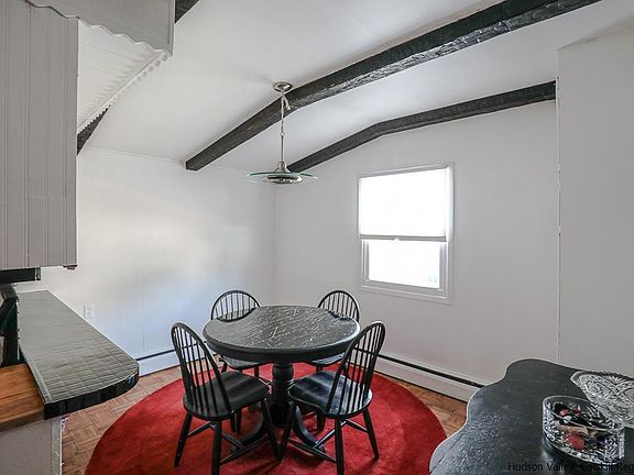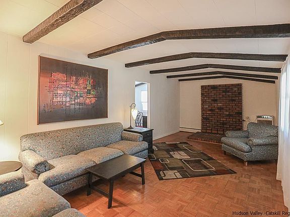 Quaint Country Ranch with 3 bedrooms and 2 full baths with over 1600Sq Ft of living space available in the Mt Marion Park section of the Town of Saugerties. This very well kept home has been freshly painted and is move in ready for the next owner. The enclosed porch is the perfect welcome and an extension of enjoyable living space. Inside you're welcome to a nice living area with dark stained beams throughout the ceiling, hard wood floors and a nice brick focal wall perfect to add your own personal touch of decor or a pellet stove. The galley kitchen with wood cabinets and dining space off to the right with plenty of space for entertaining. Continuing through the kitchen leads off to a much larger room currently used as an additional larger dining room but can easily be set up as a bonus room or family room with lots of sunlight and built-ins. This home features a master bedroom with private bath, a deck for outdoor entertaining, and a nice size yard with an additional shed for added storage. Easy to show!