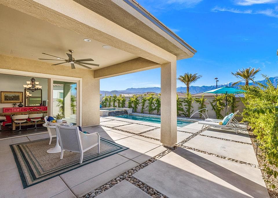 A STANDOUT in beloved Rancho Mirage. Panoramic San Jacinto Mountains, snow-capped this time of year, sets the mood. A ''zero post corner'' door system lining the living + dining rooms creates an uninterrupted sight line to those BIG VIEWS. True indoor-outdoor living. Pool + spa work some MAGIC as well. Built in 2021, 44 Prosecco at Del Webb Rancho Mirage is a case study in relaxed desert living. 2BD, 2BA + den. Island-style chef's kitchen features modern finishes and wonderful flow. LOVING the view from here. Primary retreat delivers with its large walk-in closet, spa-like bath, mountain views, and slider opening to the pool. Bedrooms enjoy plenty of separation. Desert-wise landscaping, easy care synthetic turf, and paid solar panels in place. Privacy is a theme. Direct garage access and laundry room located off front hall. Yet another plus, this home's perfect placement within Del Webb Rancho Mirage. We find it a comfortable distance to the main gate at Dinah Shore Drive and the club house with it resort style pools, fitness center, tennis, bocce ball, pickleball, virtual golf, and putting green. This amenity rich 55+ community enjoys an extremely desirable location in terms of proximity to the best of Rancho Mirage, Palm Desert, and Palm Springs. Enjoy it all.