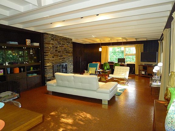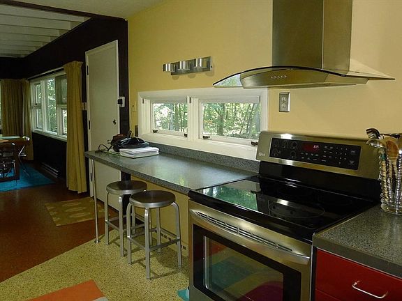 Welcome to the Evelyn Brule House. A Midcentury Modern "Atomic Ranch" designed and built by Evelyn for herself and her husband using reclaimed metal and stone in 1955. Only two additional owners have had the joy of being caretakers of this beautiful home. The Evelyn Brule House features an open floor plan on the upper level. Large picture windows create connectedness to nature outside. Two bedrooms, one full bath and a contemporary living area with a fireplace built with floor to ceiling fieldstone. The kitchen has an electric stove, hood and a stainless-steel refrigerator. Washer dryer across from pantry closet. Spacious, bright dining area with a walkout to a lovely deck. The lower level has a den/office space. Two car garage and large gravel driveway. Ample storage on the lower level in utility space. Roof was done three years ago.