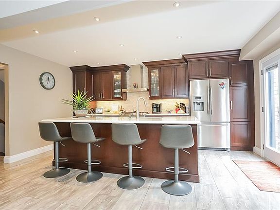 BRIMMING WITH ALL THE BELLS & WHISTLES! IMPRESSIVELY WELL MAINTAINED & UPDATED TO THE 9'S! "DECOR RESTORE" PROFESSIONALY CREATED CHEF'S KITCHEN WITH HUGE 4 SEAT QUARTZ ISLAND, TUMBLE MARBLE BACKSPLASH,POT LIGHTS, 2 PANTRIES W/ROLL OUTS, POT DRAWERS, SOFT TOUCH WATER FALL CABINETRY BLANCO DEEP DOUBLE SINKS. APPLIANCES INCLUDE UPSCALE GAS RANGE, COUNTER DEPTH S/S FRIDGE, S/S DISHWASHER, AWESOME RANGE HOOD & MICROWAVE. FEATURES RECENT ROOF 2015, FURNACE & C/AIR 2012, OWNED TANKLESS WATER HEATER, CALIFORNIA, CEILINGS, ALL HARDWOOD & PORCELAIN ABOVE GRADE, WIDE BASEBOARDS, BASEMENT BERBER. AGGREGATE DRIVEWAY & WALKWAYS WITH 2 SIDE GATES LEAD TO BEAUTIFUL BACKYARD WITH DIRECT GAS BBQ, GAZEBO, FLAGSTONE PATIO, UNIQUE SHED, ROCKERY & GARDENS WITHIN CEDAR FENCING. KITCHEN BAR STOOLS NEGOTIABLE. MASKS, GLOVES, SANITIZER IN PLACE. ROOM SIZES APPROXIMATE.