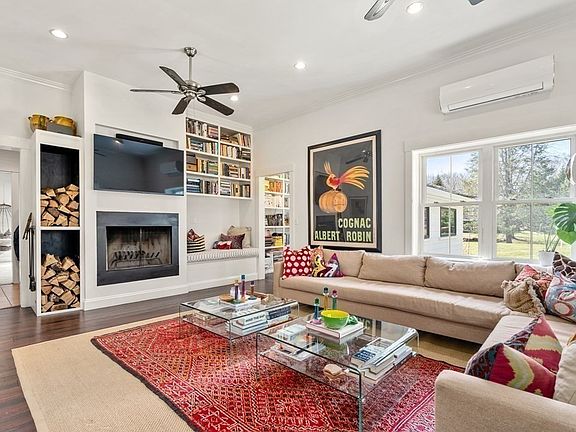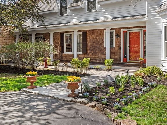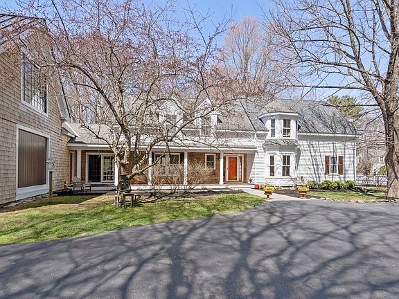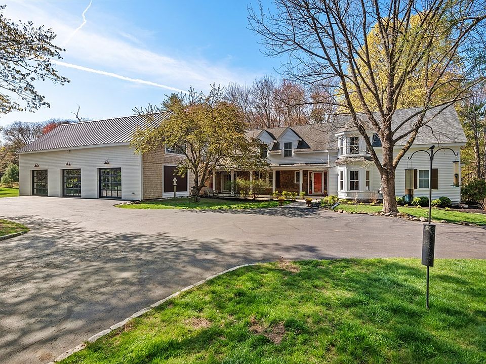 An exceptional "Circa 1891" renovated Antique in the heart of Sherborn! Beautifully sited and expanded, this notable home is not to be missed. A jewel lies behind the white fence with its courtyard entrance to welcoming porch and entryway Bright white kitchen with gas cooking, stainless appliances and center island with granite counters. Eat in dining area with French doors to front porch and back mahogany deck overlooking spacious backyard. Built in hall office outside of family room. The wide pine floors in dining/livg area with built ins accentuates the charm.The living/fam room with fireplace and grand bookcass is terrific for entertaining. 3 bedrooms on second floor incl large primary suite and walk in closet and new carpeting. First floor guest bedroom is great for company. Hot yoga studio above garage with bonus/storage loft. 2023 central air and more! Third garage bay currently outfitted as 3-season porch. Sidewalks to town center & library.