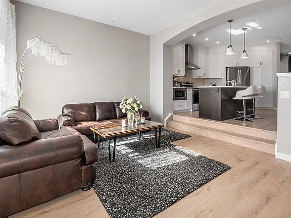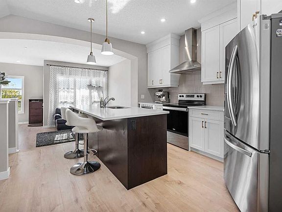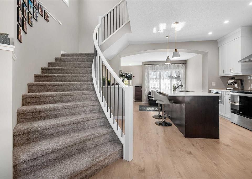 OPEN HOUSE SATURDAY OCTOBER 4TH 11am-1pm!!! EXTREMELY UNIQUE BROOKFIELD BUILD - BELVEDERE MODEL - TONS OF UPGRADES. Welcome to this exceptional, extremely unique Brookfield built, sought after belvedere model home located right across from a proposed new school, many major bus routes and in the heart of one of Calgary’s newest and most updated communities—Livingston. This beautiful two-storey home is packed with charm and premium upgrades, featuring a thoughtfully designed main floor layout, that showcases a sunken living room and an elegant curved staircase tucked toward the back of the home with dual skylights above, soaring ceilings, a builder upgraded flush-mounted sprinkler fire suppression system, a luxurious lighting package, and premium vinyl plank flooring throughout. The spacious living room is soaked in natural sunlight and anchored by a sleek electric fireplace, creating a cozy yet modern ambiance. Just a few steps up, the elevated kitchen and dining area offers a sense of separation and sophistication, featuring all stainless steel appliances, recessed pot lighting, full-height premium cabinetry, and a large central island perfect for family meals or entertaining guests. From the dining area, step out into your own serene, backyard oasis, complete with covered seating under a charming gazebo—the ideal spot for relaxing on warm evenings or hosting unforgettable family gatherings. Back inside, head upstairs on your featured curved staircase to find your personal retreat in the large primary suite, which offers a spacious five-piece ensuite with a full standing glass-door shower, separate soaking tub, large vanity, and a walk-in closet that ticks all the boxes. Just off the primary suite, enjoy your morning coffee or unwind at the end of the day on your oversized private balcony, soaking in the peaceful views of your quiet, family-friendly neighbourhood in total comfort and privacy. Across the upper level, you’ll find two more generously sized bedrooms that share another full four-piece bathroom, making this layout ideal for a growing family, guest space, or a convenient home office or hobby room. Downstairs, the basement offers a blank canvas with bathroom rough-in and two large windows, giving you the freedom to create your dream space—whether it’s a home gym, media room, kids’ play area, or future development. With this many premium features, smart design choices, and a layout full of unique charm and character, this home is everything you’ve been waiting for and more—book your private viewing today and see what makes it so special!