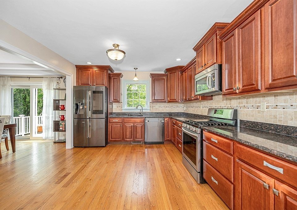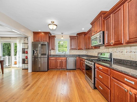 Welcome to 44 Sachem Street, Waltham! This lovely contemporary Colonial is tucked away on a dead-end street and offers both style and function. Enjoy a fenced-in yard with professional landscaping and a beautiful patio, perfect for outdoor living. Step inside to a stunning open-concept living space featuring gleaming hardwood floors throughout the main level. The updated kitchen boasts modern cherry cabinetry, granite countertops, seamlessly flowing into the bright and airy living and dining areas. The formal dining room features a coffered ceiling and opens to a rare deck, ideal for enjoying the outdoors. Upstairs, the primary suite offers crown moldings and a private en suite bath for your comfort. The finished lower level includes a versatile bonus room and a spacious family room that walks out directly to the backyard patio, providing additional space to entertain. Additional highlights include 2 zone central A/C & FHA heating system by propane. Make this your new home today!