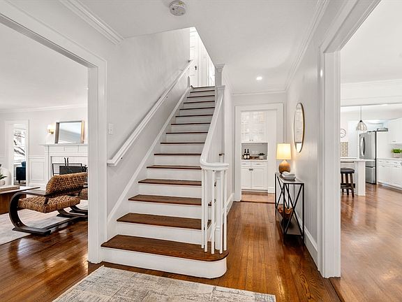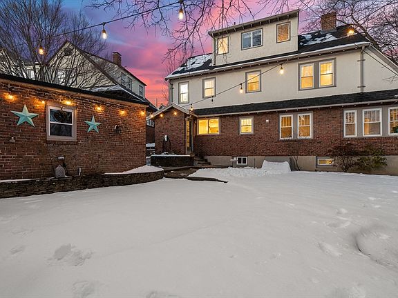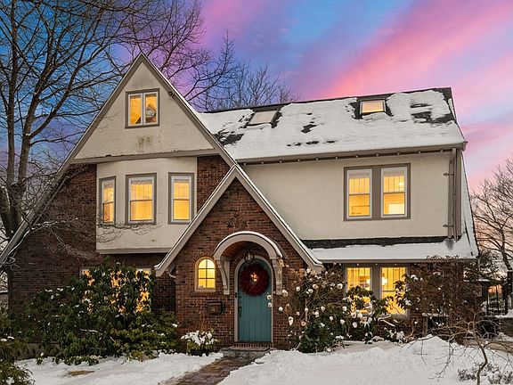 Welcome to this bright and stunning Tudor-style home, perfectly situated near the Cambridge line. Perched on a hill with many lovely classic homes, it offers skyline views, picturesque sunrises, and ample natural light. Step inside to find a welcoming foyer that leads to the formal dining room and an updated kitchen featuring newer appliances, quartz countertops, and a convenient breakfast bar. The main level also boasts a renovated half bath with laundry, a sunny family room, and a spacious living room with a fireplace. Upstairs, the 2nd floor includes an ensuite primary bedroom with full bath, 2 additional bedrooms, and family bath. Skylights illuminate the top floor, offering a 4th bedroom, renovated full bath, and large bonus space for a home office. Lower level features a 2nd laundry area, plenty of storage, and space for a gym. Recent updates include recessed lighting, new hardwood on the 3rd floor, a 2018 roof, a 2023 EV charger, and more.