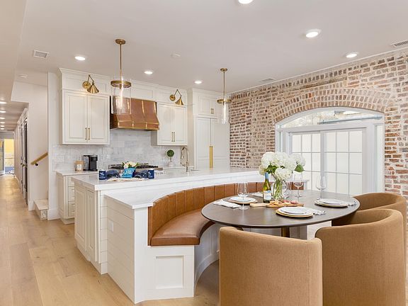 Entertain with ease in the unique dining area, featuring booth seating and cozy armchairs, perfect for gatherings with loved ones. The gourmet kitchen boasts a full suite of luxury appliances and ample space for at-home meals and snacks.