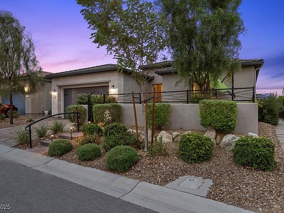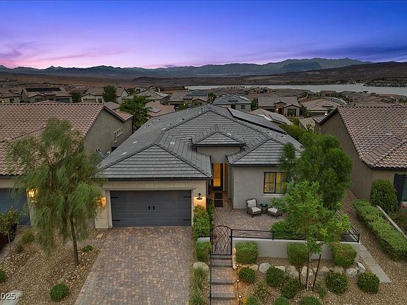 Enjoy this modern single-story home on one of the most desirable lots in Del Webb at Lake Las Vegas (LLV). This elevated home was built on a "cut lot"offering a strong structural foundation with breathtaking mountain and lake views. Designed for comfort & versatility, the flexible layout includes 2BD + flex rm that may serve as a den, office, sitting area, or guest space. Interior features include custom cabinetry, a living room fireplace, & an additional nook off the laundry—ideal for an office or creative space. The front courtyard is enclosed with custom wrought iron details, providing privacy & charm. The backyard is ideal for relaxing or entertaining with an expansive pergola, built-in spa, fire pit, and multiple seating areas; all set against dramatic desert mountain & water views. Pricing includes membership to the LLV Sports Club, a $25,000 value! Just minutes to Montelago Village w/dining, shopping, grocery, & water activities, & ~35 mins to the Las Vegas Strip.