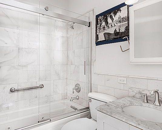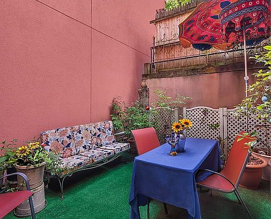 The king-sized bedroom offers a quiet retreat with two large closets and direct access via glass enclosed doors, to a private backyard —perfect for enjoying a morning coffee or a glass of wine. The backyard is fully equipped with electricity as well. A renovated marble bath with a soaking tub adds a touch of comfort and ease.