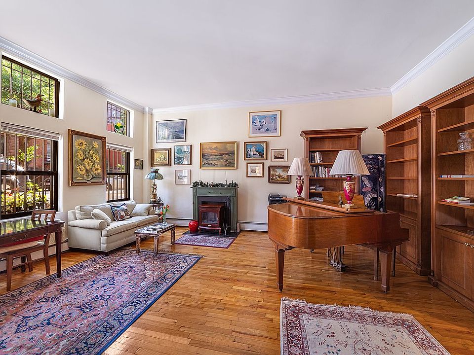 This rare Postwar condo just off Central Park is filled with sunlight and character. Tucked behind a private gate, the home feels like a hidden gem. Inside, soaring double-height ceilings and oversized windows create an airy, dramatic backdrop, while details like stained glass, crown moldings, and hardwood floors bring timeless charm. A welcoming foyer opens to a spacious living and dining area, currently home to a baby grand piano once played by jazz great Terry Waldo.