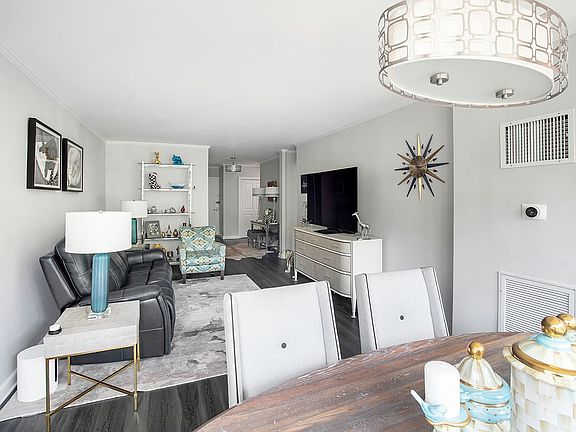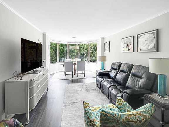 This beautifully proportioned 1-bedroom home has been thoughtfully renovated by its current owners, who have used it only lightly as a pied-à-terre. From the moment you enter, you’re greeted by a charming entry area that opens into an expansive living room. The heart of the home is the dining area, which is framed by stunning west-facing bay windows overlooking treetops and the iconic Lincoln Center and Fordham University's Sculpture Walk.