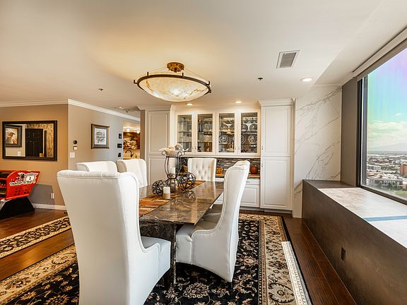 Welcome to one of the most exceptional residences ever offered in American Towers. Perched on the 14th floor of the South Tower, this fully reimagined condo is the only home of its kind-a modern, high-design retreat with 270-degree mountain and city views that stretch from sunrise to skyline sparkle. Completely taken down to the studs and completed in 2023, this home was rebuilt with premium materials and custom architectural details throughout, including Neolith stone cladding, engineered walnut flooring, mahogany doors with forged hardware, and upgraded lighting at every turn. The result is a residence that feels timeless, solid, and intentionally crafted. A full Control4 smart-home system runs the entire space-whole-home audio, independent video distribution, Italian-made motorized blinds, and integrated automation that makes day-to-day living effortless. Inside, the intelligent floor plan offers three bedrooms and three bathrooms, including a concealed office/guest suite and a luxurious primary retreat. Floor-to-ceiling windows fill the home with natural light and frame the evolving downtown landscape. A standout feature of the home is the professional-grade Dolby Atmos theater, complete with a 13.5' motorized screen, hidden Nexus projector lift, acoustic wall panels, luxury reclining seating, blackout blinds, and an LED starfield ceiling-an unparalleled cinematic experience rarely found in high-rise living. Additional highlights include two real-flame EcoSmart fireplaces, a fully upgraded kitchen with cherry cabinetry and quartzite counters, and a thoughtfully designed dining and living space built for both comfort and entertaining. American Towers offers unmatched convenience with 24/7 staffed security, secure underground parking (1 dedicated stall included; additional spaces available for rent), two rooftop terraces, an indoor pool, spa, sauna, fitness center, racquetball courts, and inviting community lounges. Located in the heart of downtown-just steps from the Eccles Theater, City Creek, award-winning dining, shopping, and TRAX-this residence delivers elevated living without compromise. A rare opportunity to own an award-winning, 2024 Parade-of-Homes-featured condo in one of Salt Lake City's most iconic towers. Homes like this simply don't come around twice. Nearly all furniture and dcor seen in the home are included in the sale; a detailed inventory list can be provided upon request. Be sure to explore the two virtual tours provided.
