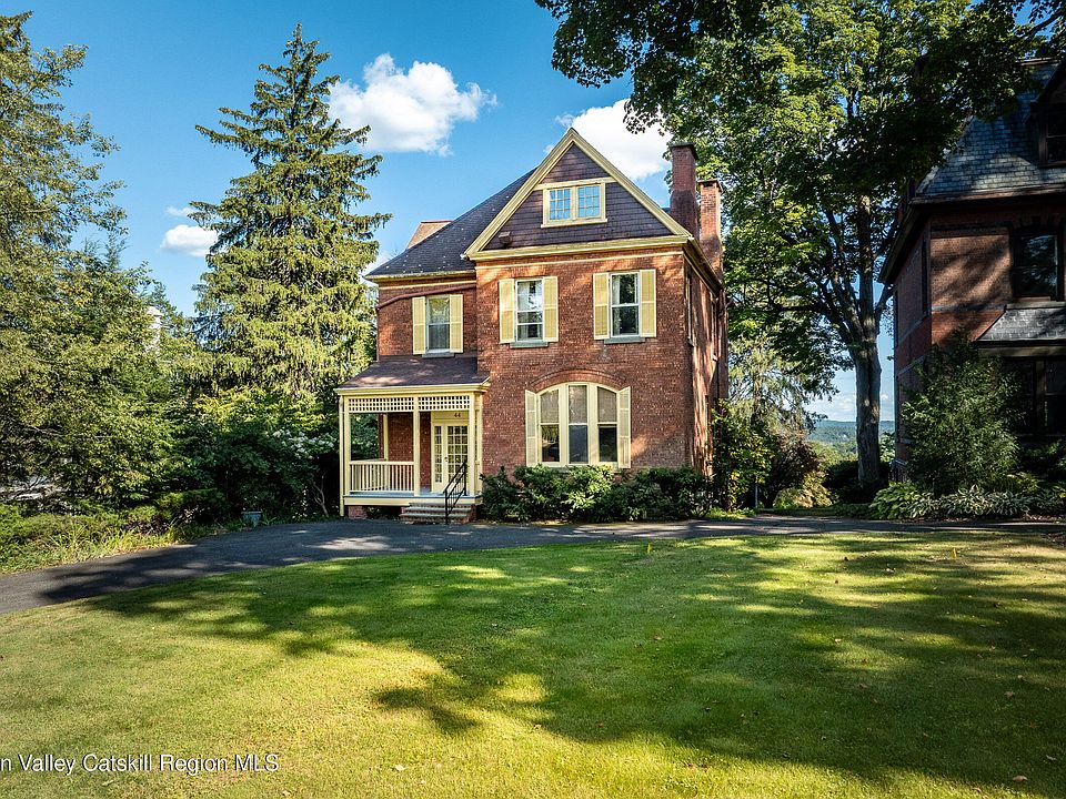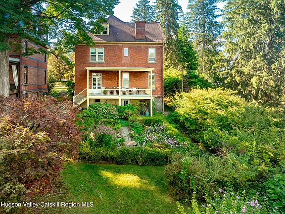 Original charm and character, with a legendary view: This gracious Queen Anne style home, originally built in the 1880s for attorney Charles Cantine on a high perch of Kingston's historic West Chestnut Street, is walkable to all the action on the Rondout waterfront but still evokes an earlier era. Fronted by an old-school vestibule and a Dutch door featuring its original bottle-glass window, the house features symmetrical front and back parlors, with the beamed back parlor opening to a gracious verandah overlooking a park-like sanctuary of a backyard, and, beyond, the Hudson River in all its year-round splendor. On a street built by brick barons, renowned architects and Hudson School landscape artists, the house still affords the dramatic 4-season views of sunrises, sunsets and wildlife, including hawks, that those artists memorialized in their paintings more than a century ago. Inside, that lineage is also evident in the grand three-story staircase, Arts & Craft-style fireplace surrounds, hardwood floors and built-ins. In addition to the grand open parlors, the main floor features a third oversized room, also with its own fireplace and river views, suitable for dining or an expanded kitchen. Upstairs are 3 large bedrooms, all but one with unobstructed views, and a full bathroom. The third floor features 2 additional finished rooms plus separate storage space, and affords a dramatic view not just outward, but downward too, from the apex of the extraordinary 4-sided and windowed staircase. The verandah and front porches have both been extensively restored in recent years. Other improvements include a natural-gas boiler and ducted central air-conditioning. This is a rare opportunity to own a house with vintage character and unique vistas in a much sought-after location, just 2 hours by car or bus from NYC and minutes by foot from the restaurants, galleries and boat launches that have made the Kingston Rondout one of the hottest neighborhoods in the Hudson Valley.