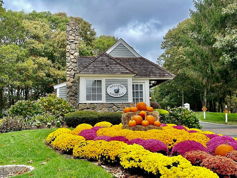 Welcome to 44 Wildflower Lane, located in the premiere community of Kings Way. This roomy G style one level home offers an expansive open floor plan, show casing skylights and dramatic cathedral ceilings. You will be greeted by the delightful foyer that adjoins the open bright kitchen/dining area/ Stainless steel appliances solid counter tops. Stunning formal dining room flows to the sunlit living room/elegant gas fireplace/ sliders to private patio. Dreamy primary bedroom with walk-closet and En-suite bathroom. Lovely guest bedroom within steps to full bath. First floor laundry attached two car garage, enormous full basement to surely accommodate all your storage needs. This Golf course community offer's a host of desirable amenities.