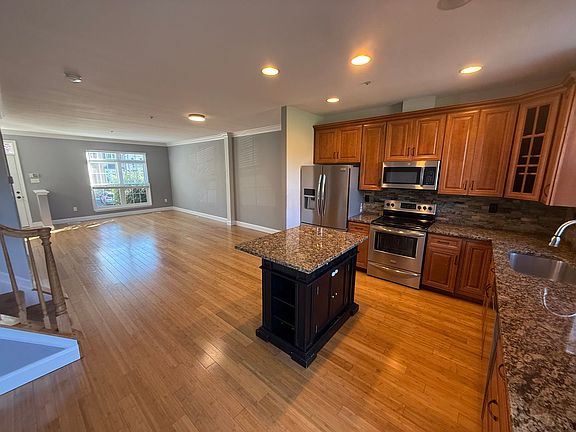 - Modern kitchen with stainless steel appliances and kitchen island. Open concept on first floor between kitchen and living room allows for more usable space