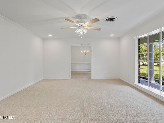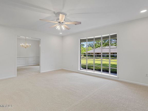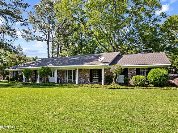 Newly Renovated Ranch-Style Beauty in Gated Rollingwood. Welcome to your dream home in the prestigious gated neighborhood of Rollingwood. This beautifully renovated ranch-style home boasts over 3,100 square feet of thoughtfully designed living space, perfectly situated on a spacious corner lot with mature landscaping and plenty of room to relax and entertain. As you enter through the front doors, you're greeted by a generous foyer that opens into a stunning living room, featuring brand new carpet, fresh white paint, and a large bay window that floods the space with natural light. Adjacent to the living room, the formal dining room is anchored by an elegant gold chandelier—perfect for entertaining guests in style. Step into the show-stopping kitchen, complete with quartz countertops, stainless steel appliances (including range, oven, dishwasher, microwave, and range hood), a designer backsplash, ample cabinetry, generous counter space, and an inviting breakfast area. Just off the kitchen is a walk-in pantry like no other—hidden behind a reclaimed custom door, it features beautiful tile flooring, quartz counters, abundant storage, and even space for a second refrigerator. On one side of the kitchen, you'll find a versatile fifth bedroom—ideal as a guest suite, playroom, or mother-in-law suite—with a full bath located just across the entry hall. On the opposite side, unwind in the spacious den featuring vaulted ceilings, a statement chandelier, built-in cabinetry, and a large brick fireplace with a custom cedar mantle. Down the main hallway are four additional bedrooms, including three guest rooms updated with new carpet, modern ceiling fans, and bright white walls. These rooms share a beautifully updated bathroom complete with a double vanity, sleek countertops, modern fixtures, and classic tile flooring. The expansive primary suite is filled with natural light and offers ample closet space. The private en-suite bathroom has been fully renovated with double vanities, quartz countertops, elegant gold fixtures, and a custom tile tub surround. Step outside and enjoy the peaceful backyard retreat—shaded by mature trees, perfect for hot Mississippi summers. The backyard features a patio for entertaining, a storage shed, and plenty of room for outdoor activities or family gatherings.