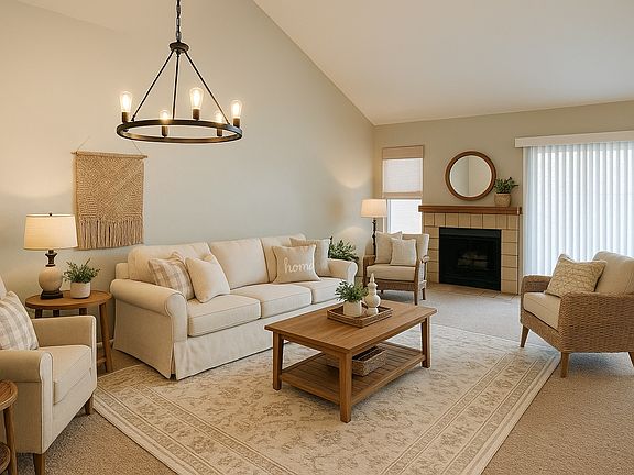 Carpeted main levelCozy living spaceFunctional layoutCharming wood-burning fireplace