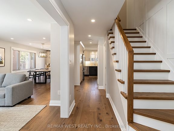 Engineered hardwoodStriking oak staircaseArchitectural detailChef-inspired kitchenPainted mdf custom cabinetryElegant quartz countertopsSs appliances