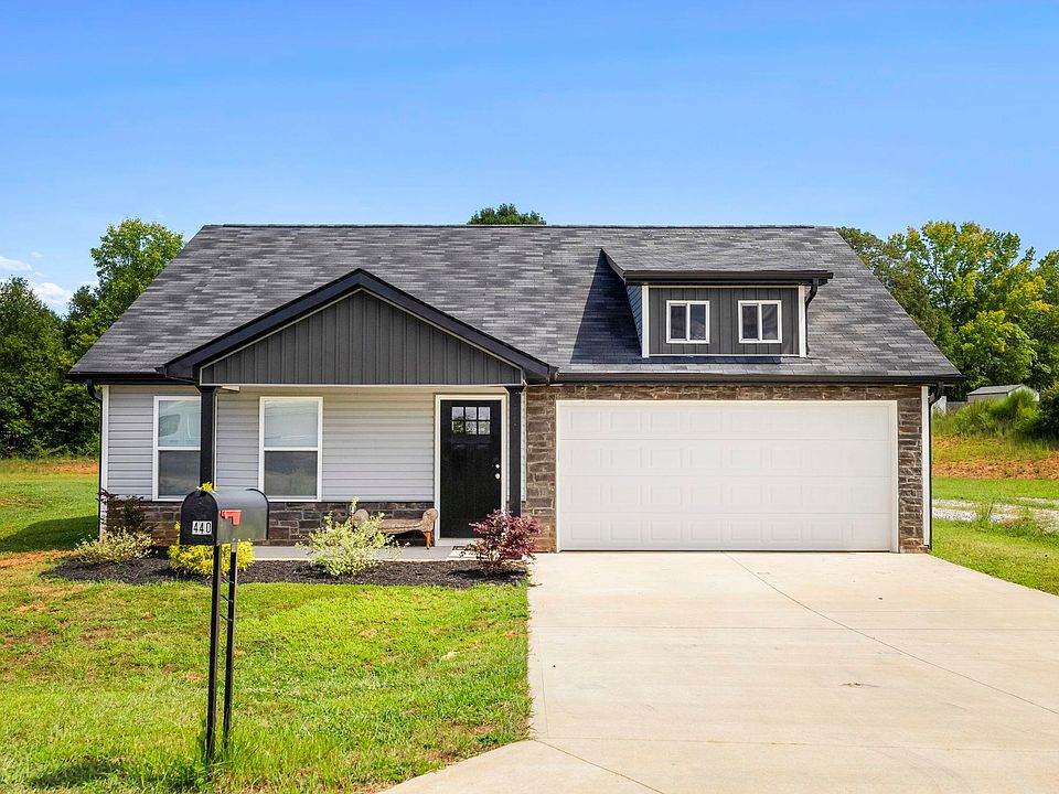 Modern 3BR/2BA Craftsman home built in 2023 in a peaceful country setting! This home features a stone-accented exterior, 2-car garage, and concrete driveway. Inside, enjoy LVP flooring in the main living areas, carpeted bedrooms, and a vaulted great room. The kitchen boasts granite countertops, stainless steel appliances, and a pantry, while the master suite offers a trey ceiling, tile flooring in the bath, and a double-sink vanity. Relax on the covered back patio and move in ready, just minutes from local conveniences!