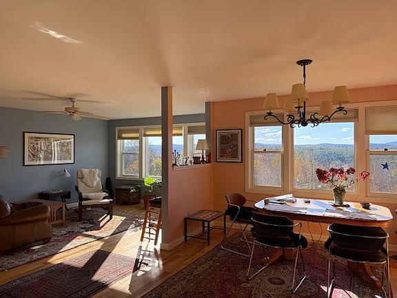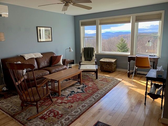 Furnished 2 bedroom, 2 bath condo with stunning views and open layout on a single level (no stairs) in a friendly quiet neighborhood in Montpelier. One year lease minimum, $2450 plus utilities. Water/sewer/garbage and plowing are included in rent. Garage and one outdoor parking space included. There is an electric car charging station, an outdoor swimming pool and 2 tennis/pickleball courts with basketball hoop on the property. Built in bookshelves/cabinets and fireplace (not functional) in living room. Table for 6 in dining room. King-sized bed in master bedroom, and 2 closets. Second bedroom has twin bed, 1 closet. Work table available to be placed as desired. Table for 4 on small deck with views. Washer/dryer in second bathroom. Wood floors in living/dining and hall areas; carpeting in bedrooms. Heat pumps for heating and cooling, and back up propane heater.