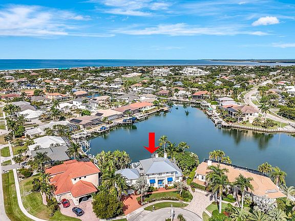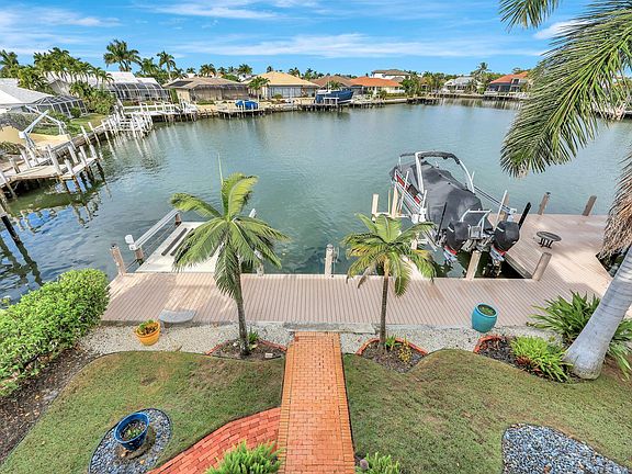 Discover island living with timeless style in this West Indies/Key West-inspired coastal retreat tucked away on a quiet cul-de-sac. This fabulous home blends classic tropical architecture with relaxed coastal elegance, creating an inviting, breezy atmosphere. The exterior showcases crisp architectural details, a metal roofline, and lush tropical landscaping. Inside abundant and plentiful natural light fills the living space, where vaulted ceilings and refined finishes strike the ideal balance between Caribbean sophistication and Key West casual comfort. The main living area with fireplace flows effortlessly into a beautifully designed kitchen, making it ideal for both entertaining and everyday living. Multiple sets of French doors open to your private outdoor oasis, with a sparkling pool, covered seating areas, and swaying palms, an idyllic backdrop for al fresco dining, relaxation, and gatherings with friends and family. For boating enthusiasts, this property is a dream. Other features include 3 new AC units, 2 new in 2025 and the 3rd less than two years old; Wolf and SubZero high-end appliances; wine cooler and beverage center in kitchen; spacious 2-car garage; the 3rd full guest bath has been recently added, and two other guest baths have recently been remodeled. All this plus147' of water frontage, private boat dock with room for two boats and wave runners, with electric available right at the dock. The thoughtful floor plan includes two separate stairways leading to the second floor. One stairway brings you to the upstairs bedroom wing, where each bedroom features its own private balcony with outstanding views, creating an elevated and serene retreat for family and visitors. This level also includes the expansive master suite, complete with a double-sided fireplace shared with the spa-inspired master bathroom, adding warmth and luxury to both spaces. The second stairway leads to a spacious recreation room, currently used as a pool room, that also functions perfectly as a game room, media room, or flexible space tailored to your lifestyle. Practicality meets style in the well-appointed laundry room, featuring a laundry tub, front-load washer and dryer, and a generous amount of built-in cabinetry for excellent storage. Guest rooms are designed for comfort and privacy, making hosting effortless. Located just minutes from Marco Island's world-famous beaches, popular restaurants, and boutique shopping, this residence offers a rare blend of charm, character, and modern coastal living. A standout residence where West Indies elegance meets Key West warmth—this home delivers an unforgettable island lifestyle in one of Marco Island's most desirable neighborhoods.