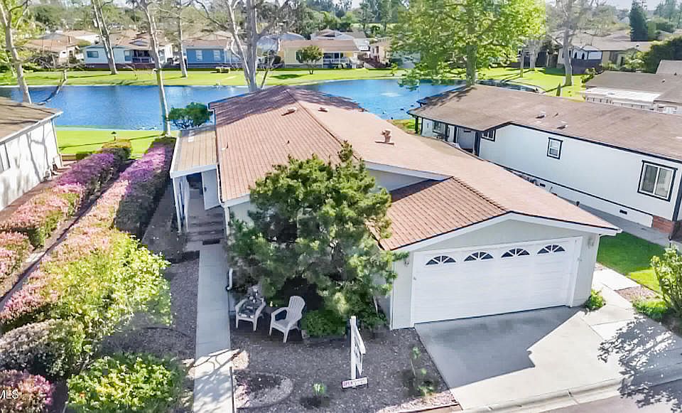 Discover a tranquil lakeside retreat in this beautifully maintained 2-bedroom, 2-bathroom home, plus versatile flex space perfect for an office or hobby room, 2-car attached garage. Nestled within a welcoming FAMILY PARK, this residence offers a serene lifestyle with breathtaking full lake views. Step inside and be greeted by an inviting open floor plan, seamlessly connecting the living and dining areas to a spacious kitchen equipped with modern appliances. The master suite is a true sanctuary, boasting direct lake views and a private porch where you can observe the seasonal dance of ducks, geese & turtles. Walk-in tub Re-Bath w/lifetime warranty, and shower in the master bathroom done about 10 years ago, bidets in both bathrooms, walking closet inside the large Mater bathroom.. Enjoy the convenience of an attached 2-car garage with ample storage, plus a third car can park in front of the garage. Newer roof installed 7 years ago. Foundation jacks re-leveled recently completed. New cement foundation and wood constructed in the back porch and adjacent office room facing the pond. Vinyl frame double pane windows completed about 10 years ago. As well completed commercial grade vinyl flooring throughout. Drip watering system for all the landscaping on programmable electric timer. Newer water heater. New freeze-proof plumbing system for the entire home installed about 2 years ago. Beyond your doorstep, the community offers a wealth of amenities, including a large clubhouse, pool, spa, gym, tennis courts, and lush greenbelts. Located just moments from the 101 Freeway and The Collection's upscale shopping and dining, this home provides a perfect blend of peaceful living and urban accessibility. Space rent is $1,112. Embrace the soothing lifestyle you deserve! Furniture, kitchen wear and fixtures are negotiable.