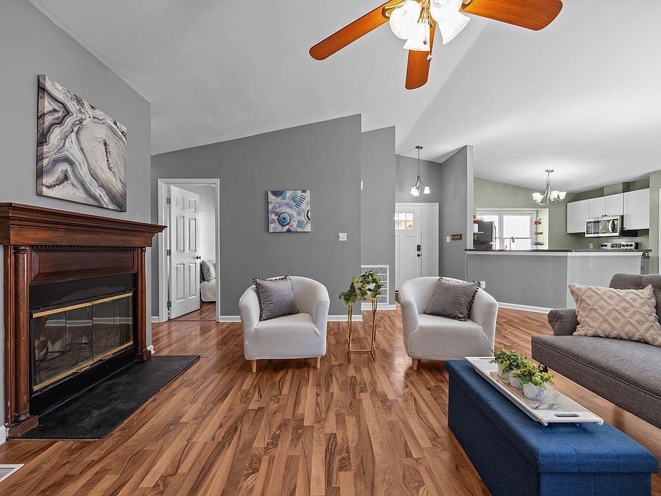 High ceilingsCozy fireplaceOpen floorplanLaminate flooringBuilt-in microwaveNew roofDriveway with extra parking