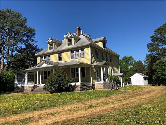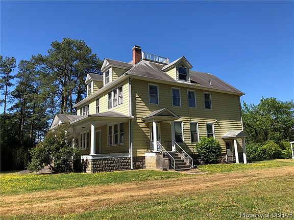 1920's 2-story home located in the village of Mathews Court House with over 7 acres of land, offering possible division and mixed-use development. Home needs renovation, large open rooms with lots of light, 10 ft. ceilings, wood floors, public sewer.
