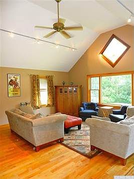 Situated on over 5 acres on a quiet country road sits this 4 bedroom, 2 bath Cape Cod. New roof August 2013, new windows and exterior doors. New furnace and water softening system. Large wrap around deck overlooking the private spacious back yard. Paved circular driveway with oversized 2 car garage. Huge great room addition with stained glass window.