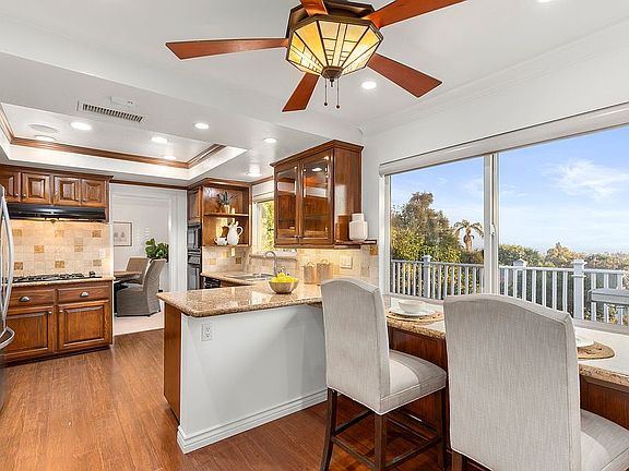 Perched on a hillside in one of Monrovia's most desirable neighborhoods, this multi-level home proudly reveals a host of fresh upgrades, ample space and beautiful city views that come alive with twinkling lights after sunset. Mature landscaping and attractive hardscaping create a welcoming ambiance on the top level, which reveals a formal living room, a formal dining room with outdoor access, and a family room with surround sound and a classic stone and brick fireplace. New paint lends a contemporary vibe to the home, which extends approximately 2,728 square feet and displays a gourmet kitchen with handsome cabinetry, granite countertops, a tray ceiling with recessed lighting, a pantry and high-end appliances. This floor also opens to a large view deck that encourages festive outdoor entertaining. Downstairs, 3 bedrooms include a master suite that accesses a covered view deck and features dual walk-in closets and a sitting area. The lowest level leads to a serene backyard complete with a resort pool and spa with a dramatic rock waterfall. A 2-car garage and a 300-square-foot basement provide ample storage, and wood flooring, new carpet, crown molding and in-ceiling speakers add to the home's appeal. A city park is just down the block, local mountains feature endless year-round recreational attractions, and excellent schools, popular restaurants and abundant shopping centers are close by.
