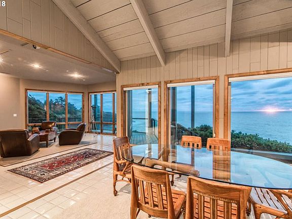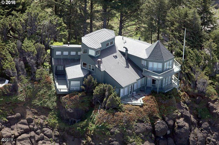 Depoe Bay ocean front home with 210 degree views of the Pacific Ocean, Little Whale Cove, tidal pools & rocky coastline. One of the most stunning settings on the Oregon Coast, this classic mid century design features an attached guest apt. w/ fireplace & kitchenette, 2 fireplaces in main house, large kitchen with stainless appliance, large game room or family room which could be converted to main level master and Crows Nest viewing room