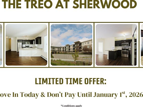 AboutWelcome to the Treo at Sherwood. This bright and beautiful apartment building in Calgary offers spacious, light-filled 1, 2 and 3 bedroom apartment suites for rent with upscale fixtures and finishes including granite countertops, stainless steel appliances and in-suite laundry. Start enjoying apartment living at its best. This rental building and location are perfect for families, seniors and young professionals.Sherwood is charming and culturally diverse with parks, paths, fantastic shopping and all the amenities you could want. The suites offer beautiful views of surrounding green spaces and a pond. With 60 acres of parks in the area including Nose Hill Park, one of Calgary's largest and best hiking, biking and off-leash areas in the city, the best kind of living is just outside your front door.