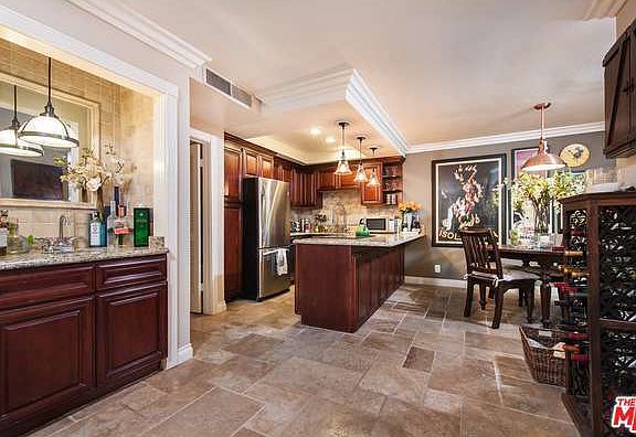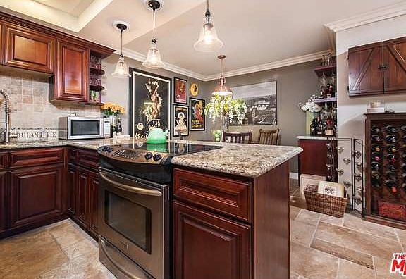Open concept one bedroom plus den/second bedroom condo just steps from UCLA & Westwood Village. Completely upgraded and turnkey. One of very few condos on the Westside with a private outdoor yard/patio with sun filled grassy area. Large Living Room with built in cabinets and wet bar. Open Kitchen & Dining Room with beautiful granite counter tops and breakfast bar. Versailles pattern tumbled travertine floors throughout. Sherwin Williams designer paint. Custom fireplace. High end light fixtures throughout. Oversize bathroom with double sinks, separate custom tumbled travertine shower, granite counter tops and flat screen TV over the bathtub. In unit washer/dryer. Walk in closet in master with chandelier and custom built shelving. Beautiful custom built in bookshelves and crown molding in both the master bedroom and den/second bedroom. Secure remodeled building with subterranean parking and recreation room. Great value!