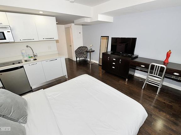 Enjoy this modern furnished studio apartment in Midtown West. The apartment itself features huge windows, which bring in tons of natural light; a recently finished bathroom and gourmet kitchen, beautiful hardwood floors and high ceilings, making this a wonderful place to call home. The unit boasts ample sunlight. Other features also include cable equipped TVs, Internet/WiFi, as well as individually controlled heat and air conditioning. Enjoy the convenience of anelevator building with a full time attended lobby. The building also includes laundry in the building. This unique building is situated in the center of Manhattan, just a short walk from Times square, Port Authority, Hudson river and Theater district. Walk to great restaurants, shopping and subways. The building is equipped with camera surveillance, 24 hour doormen and live-in superintendent. NY Sports club within one block offers tenants discount. Ample parking within 1 block of the building entrance. Piers 81, 83, 84 and the Intrepid within walking distance