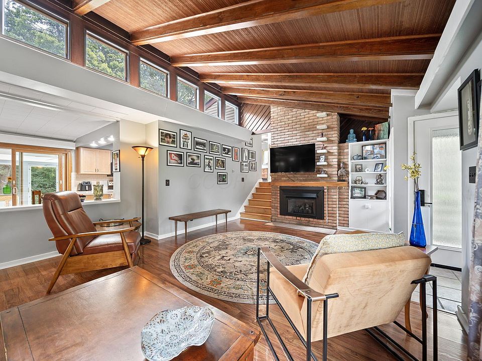 STUNNING MID-CENTURY MODERNESQUE HOME NOW AVAILABLE IN THE COVETED CORRIDOR NESTLED BETWEEN DUBLIN AND HILLIARD. Natives know the beauty and convenience of living in this area so close to the Scioto River, Ohio State, Dublin, Hilliard, Upper Arlington and Downtown Columbus. This property pulls at the heartstrings of the Artists, the Dreamers and Doers, the Hobbyists, the Naturalists - native pollenator gardens never chemically treated during ownership; meditation on the elevated deck, tinkering in the garages perfect for all sorts of enthusiasts and those beginning a journey or project requiring extra elbow room and space to spread out. Features include: 1st floor bedroom with ensuite full bathroom (shower with low threshold). 3season room overlooking the rear acreage. 1st floor office that is approximately 15x20 with a wall of windows overlooking the rear grounds - not a shoebox, but rather a dedicated space to conduct meetings or gatherings of 2-8. Large closet for private storage in here, as well. Access here to the two car attached garage. Open concept kitchen to dining to great room; a flow that encourages communication and offers Northern and Southern views simultaneously. More living space found in the 3 season room where you can't help but to feel peace, relaxation and relief from the every day..... Unique layout includes one half bath on the main level and another half bath in the lower level that includes the laundry room, utility spaces, storage spaces and exit to the 3rd garage AND additional covered carport. ROOM FOR ALL OF YOUR TOYS HERE; BIG AND SMALL, STACK IT TALL. Upstairs includes 2 bedrooms and a full bathroom. One bedroom includes a door that leads out to the elevated deck - a unique feature that fits certain lifestyles. Explore the nooks and crannies this unique property offers and envision your future here. Please read A2A for additional details as well as attached property fact sheet.