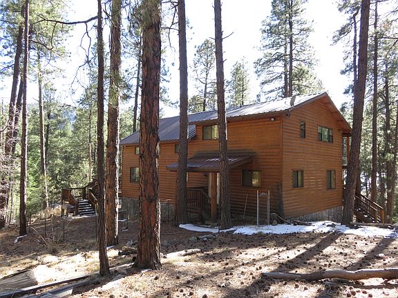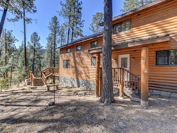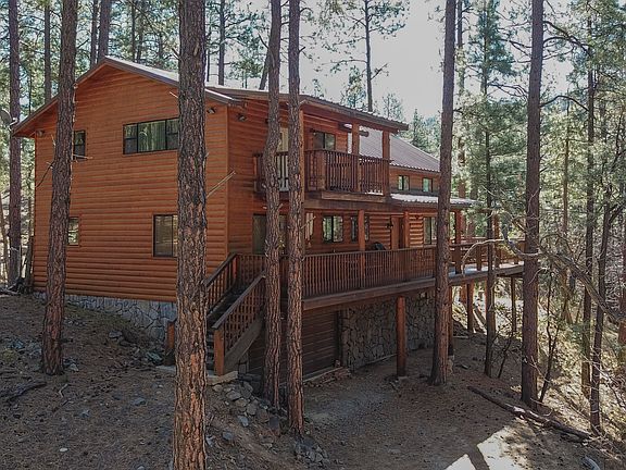 Beautiful log-sided/stone cabin with metal roof along seasonal creek on 3.57 acres in the tall pines. Year 'round access and only a short distance off paved Walker Rd. Cabin is apx 2750sf with 3 bedrooms & 2 baths, great room with vaulted tongue & groove ceiling, wood-burning stove, lodge pole accents, and lots of windows for natural light and great forest views. Spacious kitchen with large island & dining area will accommodate all your friends and family. Loft and master suite with private deck are upstairs. 2 bedrooms + 3/4 bath/laundry are on main level. Large finished family room on lower level. Central propane heat and A/C, 15+gpm private well, and Eljen septic system. Spacious open deck, as well as covered deck off main entrance and Master suite. Fenced dog run, lots of flat parking area, and two-car attached garage with large storage area.