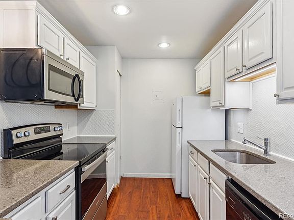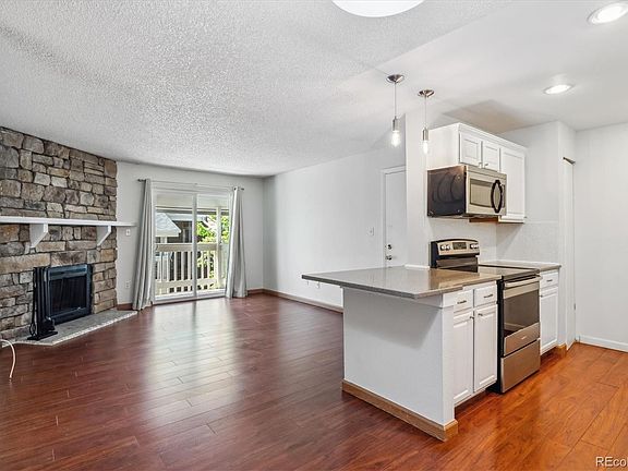 Owners lovingly remodeled this brilliant 2 bedroom/2 bath open layout condo. Excellent storage and upgrades abound. Freshly painted, new carpeting, wood laminate floors, updated bathrooms. Kitchen features gorgeous Quartz solid surface countertops and a lovely tile backsplash plus featuring bookshelf for your cookbook collection. Easy to maintain and oh-so-stylish. All stainless steel appliances including handy microwave oven. Kitchen cabinets feature Crown molding and new kickplates. Laminate wood flooring in kitchen and throughout most of condo. Bedrooms feature new carpeting. Tile floors in bathrooms. Freshly painted throughout. Lovely stone fireplace will warm up your Colorado winter nights. Primary bedroom has wall of mirrored doors and custom storage setup plus feature's it's own on-suite 3/4 bathroom. Secondary bedroom is just across the hall from a full bathroom. Owners updated the sinks and vanities. Home features a laundry room and the washer and dryer are included. Located just 1.2 miles from the Belleview Station Platform and one point five miles from Southmoor Station. It is walking distance to the 65 Bus line. Community features an outdoor swimming pool, opening day is just around the corner. Roof replaced in 2017.