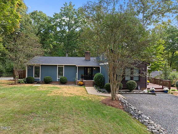 No HOA and no City Taxes! Welcome home to this beautifully remodeled 3-bedroom, 2-bath ranch in Apex, perfectly situated on a .69-acre wooded and landscaped lot. This property is stunning and combines comfort, style, and functionality — with the added bonus of a large 2-car workshop garage, ideal for car enthusiasts, hobbyists, woodworkers, or just extra storage! Step inside to discover an amazing, complete home remodel showcasing natural hardwood floors, crown molding, smooth ceilings, and recessed lighting. The gorgeous kitchen is a true centerpiece featuring white cabinetry, sleek white quartz countertops, tile backsplash, stainless steel appliances, pot filler, wine fridge, and a large kitchen island perfect for entertaining. The home also includes a spacious office/flex room, complete with pocket doors, perfect for working from home. Enjoy peace of mind with numerous updates including a new roof (2024), whole home water filtration system (2022), fresh exterior paint (August 2025), and a recently stained deck (2025)—ready for outdoor relaxation. With no HOA fees and no city taxes, this property offers freedom, privacy, and incredible value—all just minutes from the conveniences of Apex. A must see!